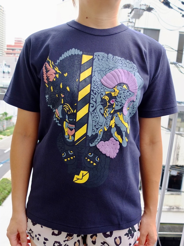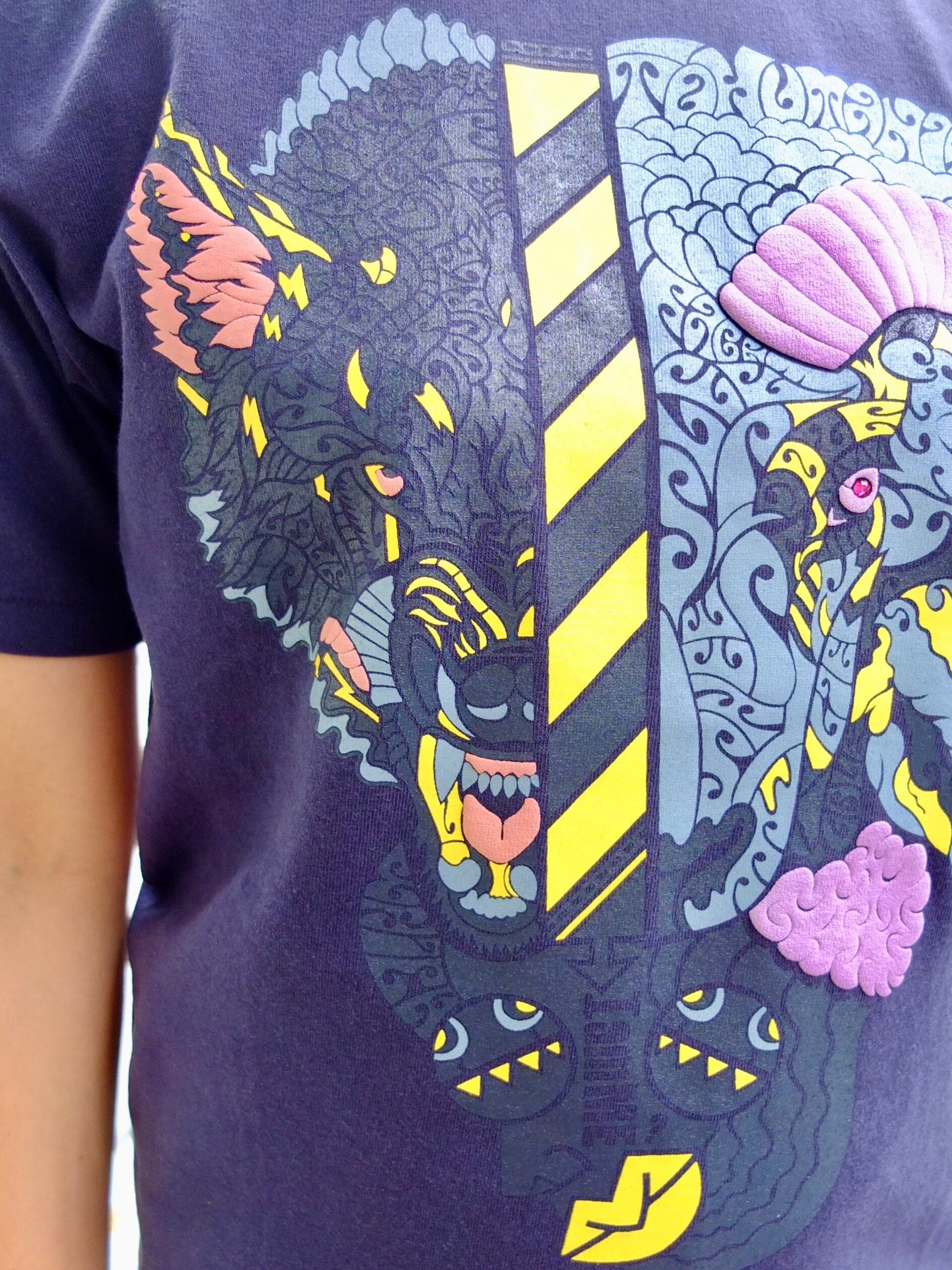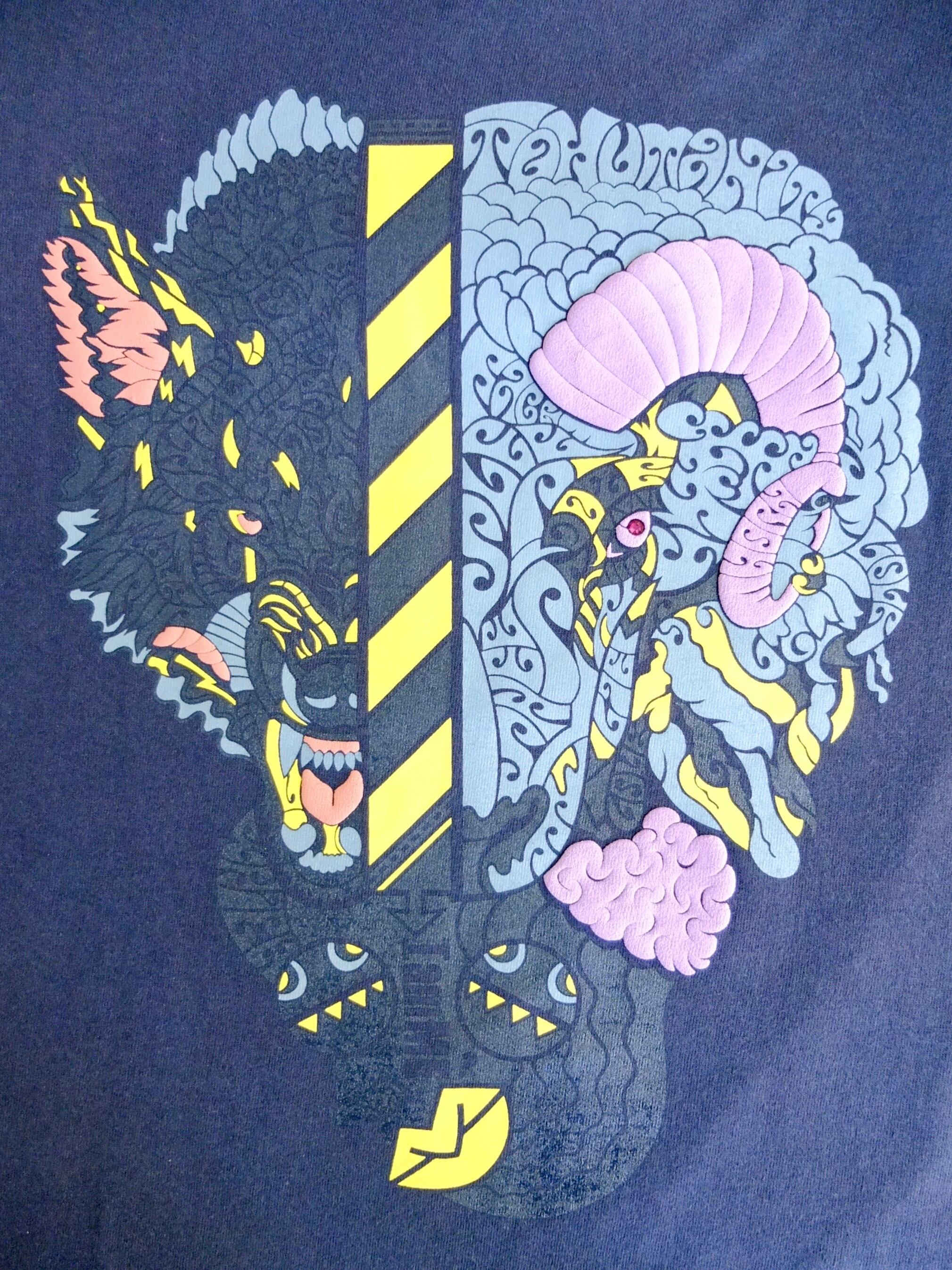 羊と狼の迫力あるグラフィックを同系色で抑えながらも、抑えきれないセンターライン。